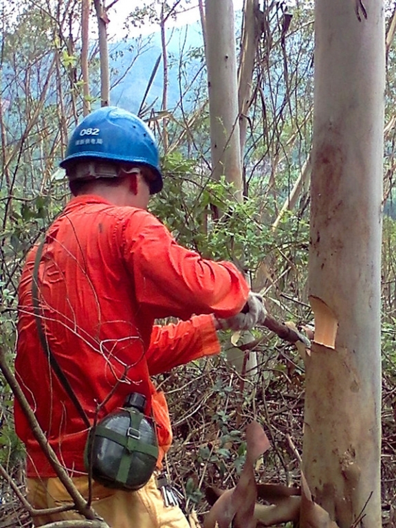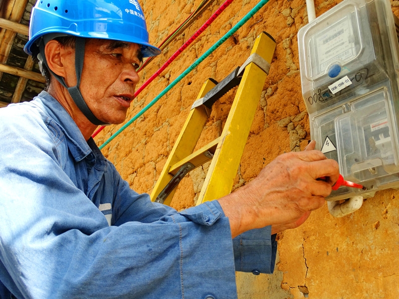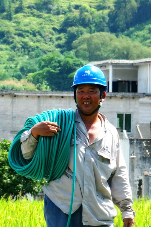 2014年6月10日在清新石坎10kV电压线路上带电作业的工人