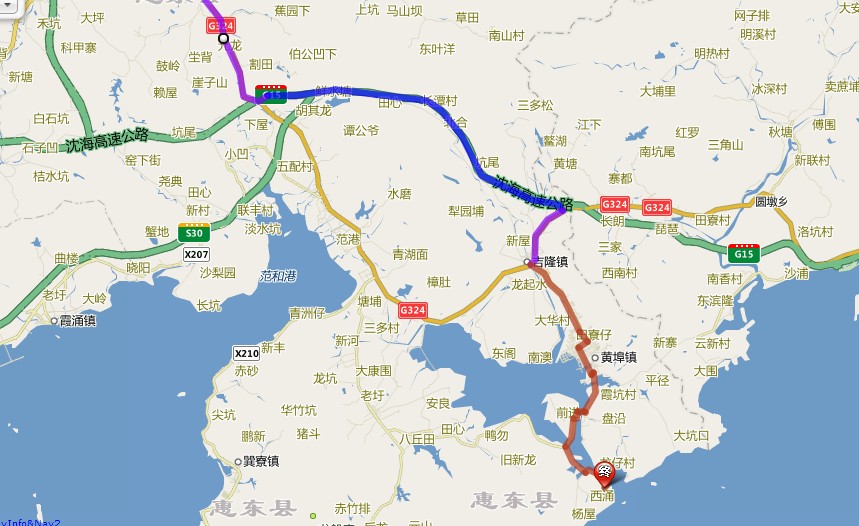 向内环路方向,经过济广高速、广惠高速,行驶167公里,直行,驶出高速,进入G324