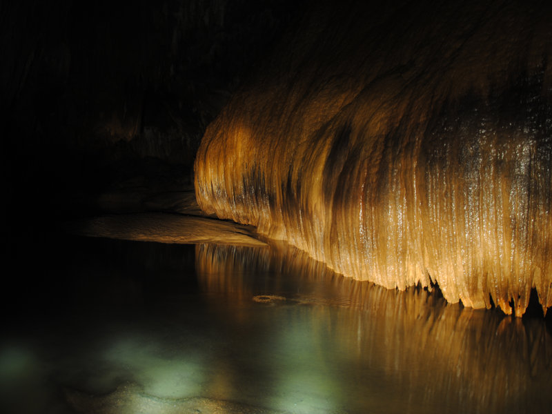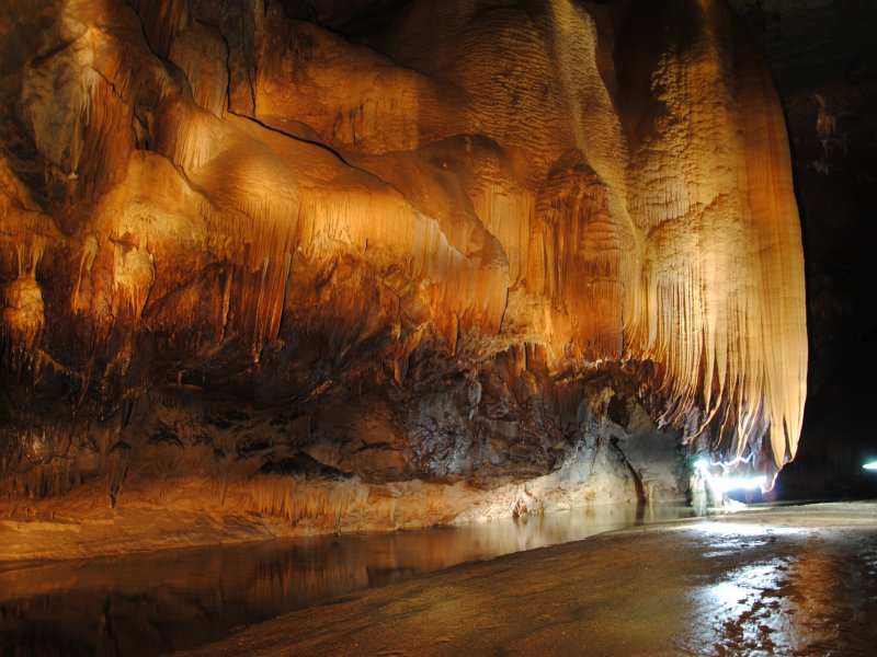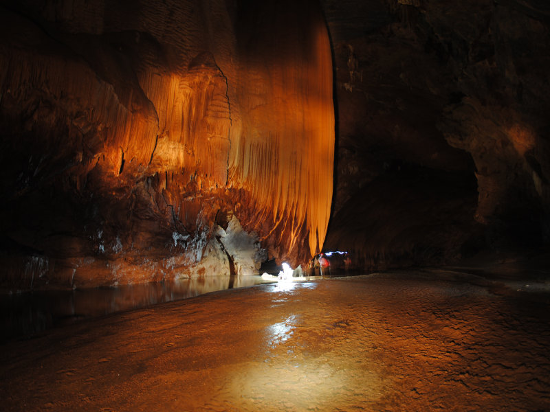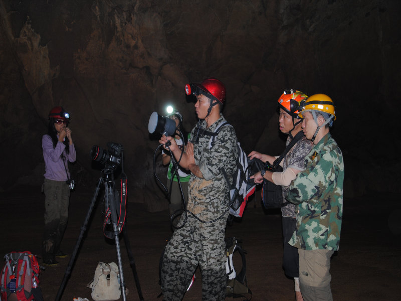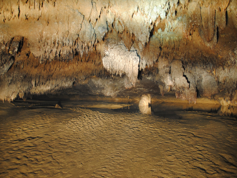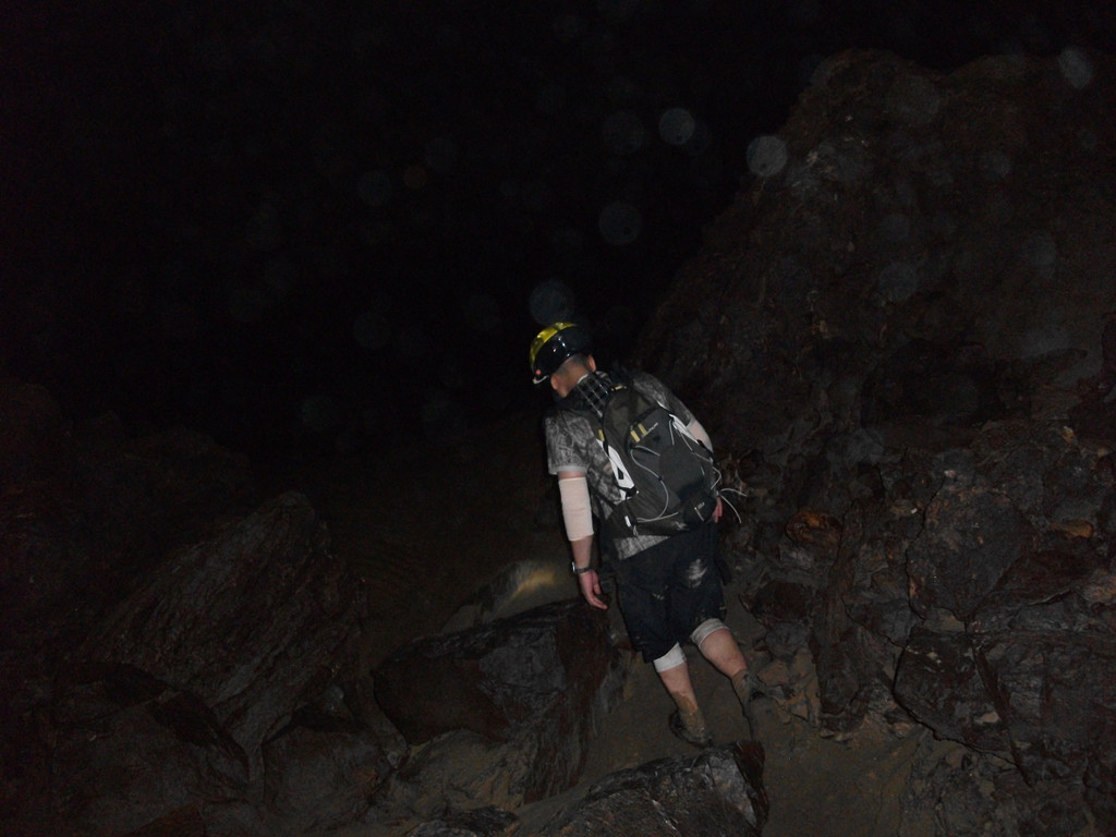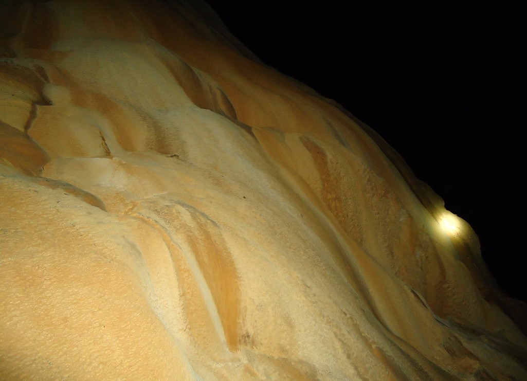 二层景色奇异,不能一一尽诉。值得一提的是我和赖伯在这里发现了一条可能通往山顶的“隧道”,“隧道”呈45度角直上, 只能并排站两人,道上覆盖着约10公分厚的精细沙土,沙土一直向上延伸,我们向上走了约100米后,发现“隧道”呈80度角急转直下,能见到的只有下面的10多米,转角后是什么就不得而知了。而右上方,仿似有一条道直通往上,因为依然有沙土从上往下流的痕迹,我们猜测:沙土会不会从地表流下来的?如果是的话,那这条道就直通地面了。但如果要爬上去,很难,因为几乎是90度直角往上,况且,脚下还有一个深不可测的“隧道”。权衡之下,安全至上,我们决定返回。