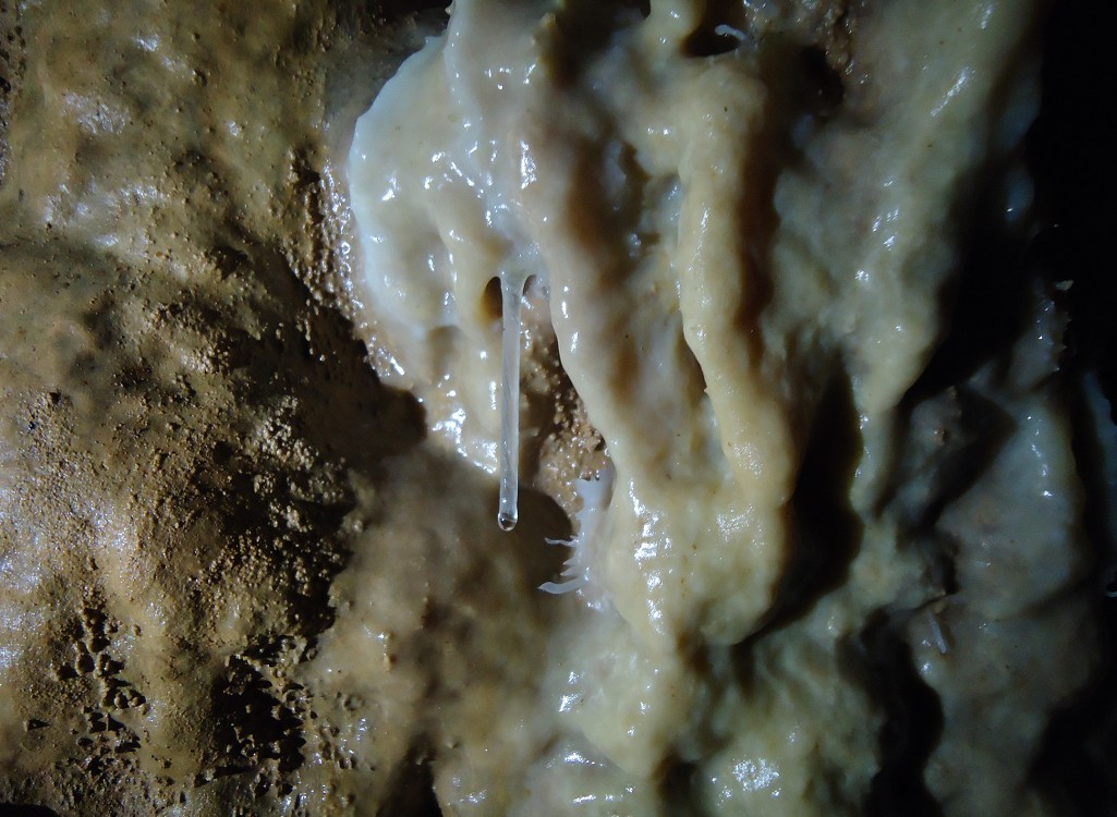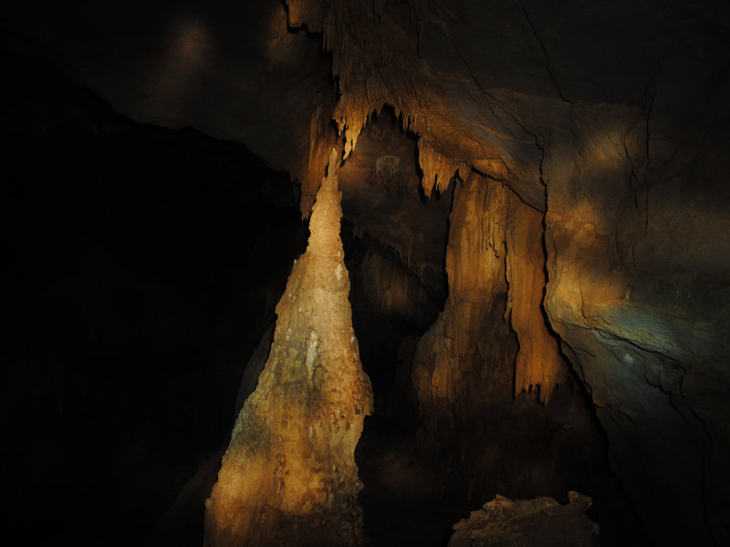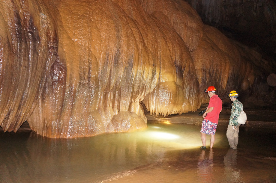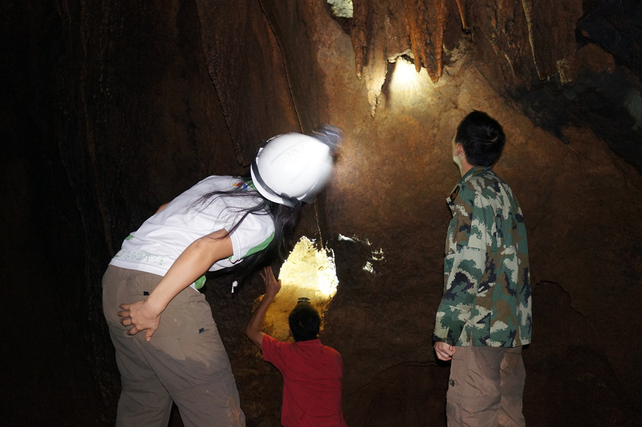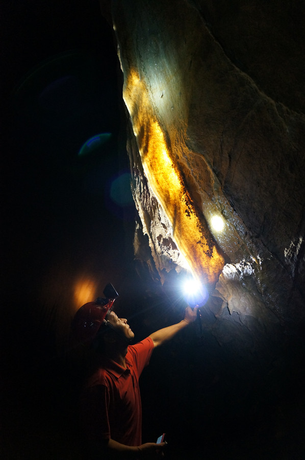 洞内除有大厅外,还有“复式”,需爬一段斜坡才能上去,幸好斜壁不是滑面,都是有纹理的,只要有一定攀爬经验的人都能上去,二层的门口有一对“神兽”在守护,一子一母,对来人张开血盘大口,上下齿间粘着稠稠糊糊的唾沫。。。。我们需攀爬上石坡绕过“神兽”才能到达二层参观。神兽啊,我们只是一队虔诚的参观者 ,没有恶意,没有破坏,更没有亵渎大自然,请原谅我们打扰了你们的清静。