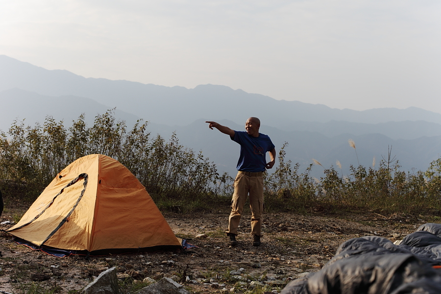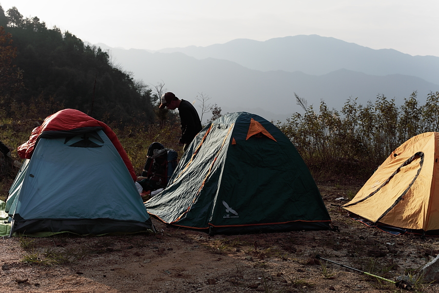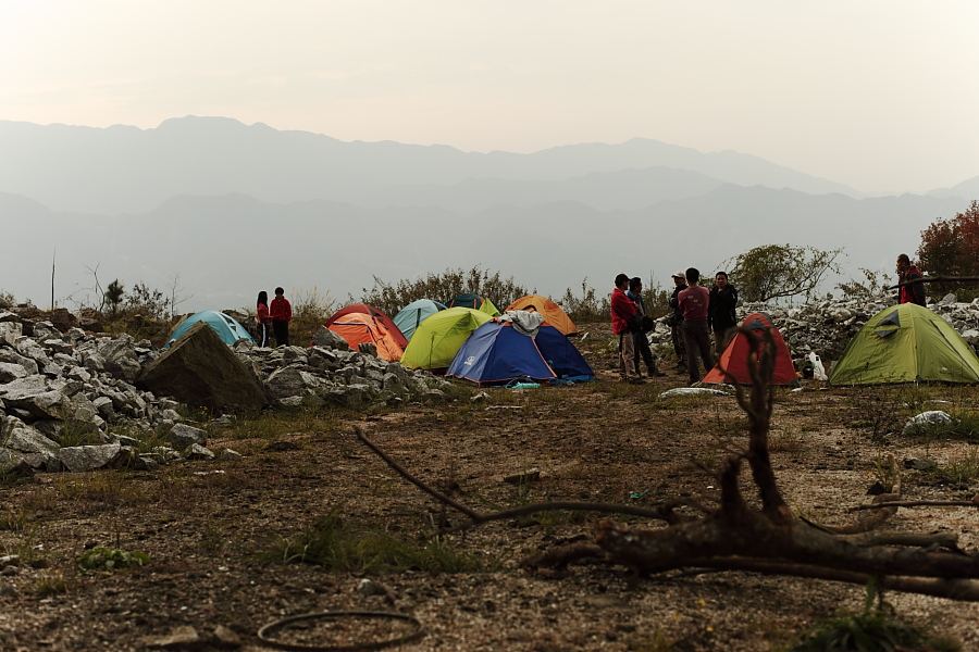 下午3时左右到达距观音顶约250米的废弃矿场休整。老K侧带领几个强驴轻装探路去了。其余的同学坐在矿石堆上一边晒着太阳一边欣赏着山间的美景,天马行空的瞎聊着。突然坐在一旁的四哥大呼:快看!金石!一听到金石,坐在石头上的我们立马从石块上蹦起来争抢着看四哥发现的金石。可拿起四哥手中的金石左看右看、上看下,怎么也看不出来是块金石呀,只是一块普通的矿石而已吗。看着不懂的我们,四哥拿着那块矿石朝着太阳光指给我们看:“看!这闪闪发光金黄色的就是黄金!”四哥教我们怎么辩识什么是金石,什么是硫矿石。于是,我们开始在矿石堆上寻找起黄金石来,早已把登顶忘得一干二净了。就在我们忙得不亦乐乎时,探路且成功登顶的强驴们回来了。领队考虑到我们的体力参差不齐以及登顶的线路比较难,而且山顶上当地村民所说的那个能容纳二三十人的平台其实是指能容纳二三十人站立,而不是扎营。宣布就地扎营,看日落,第二天早上再轻装登顶看日出。众人开始分工合作,搭帐、捡柴、打水、开灶。在太阳下山之时我们搭好了帐蓬。升火做饭,香喷喷的腊味饭、美味的鹅肉煲、麻辣肉丸面、香软可口的葱花鸡蛋饼,这么丰富的晚餐当然少不了美酒。酒足饭饱后,围着篝火观星、听歌、拍照后洗刷入帐就寝,等待着明天的日出。而意犹未尽的浪儿和老K、左手等人继续吃着肉喝着酒星夜畅聊。