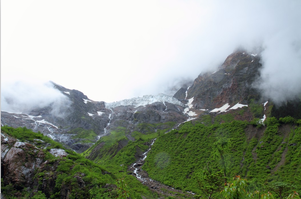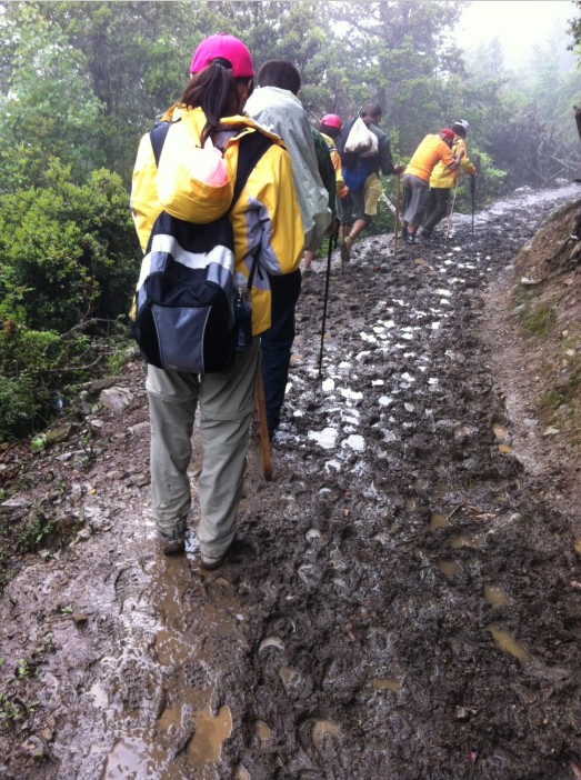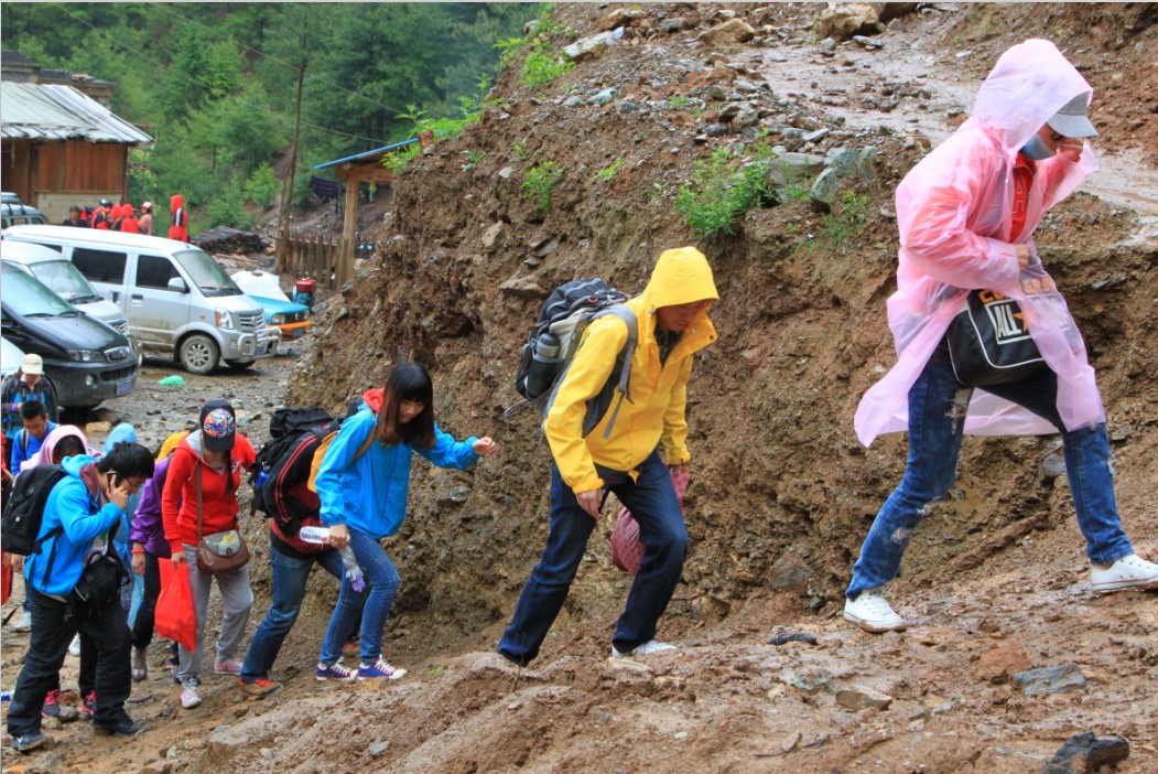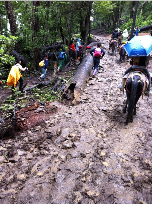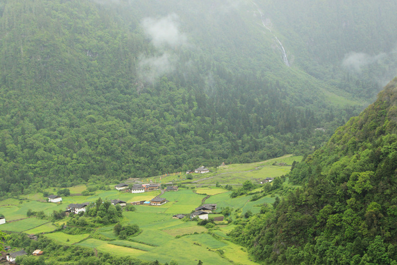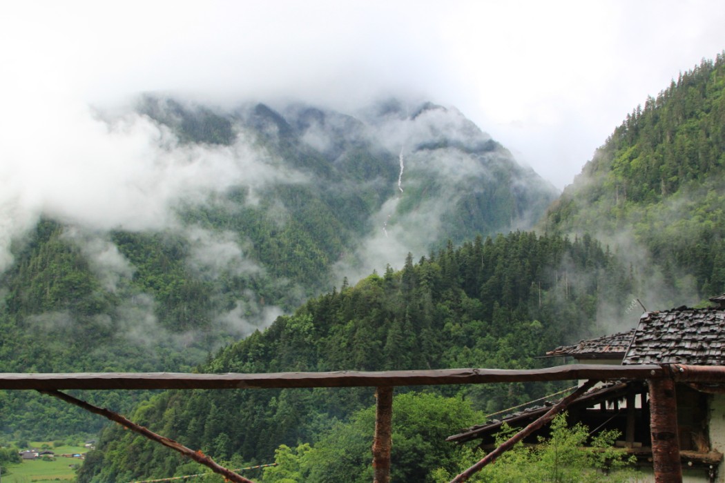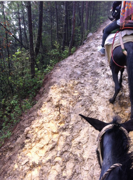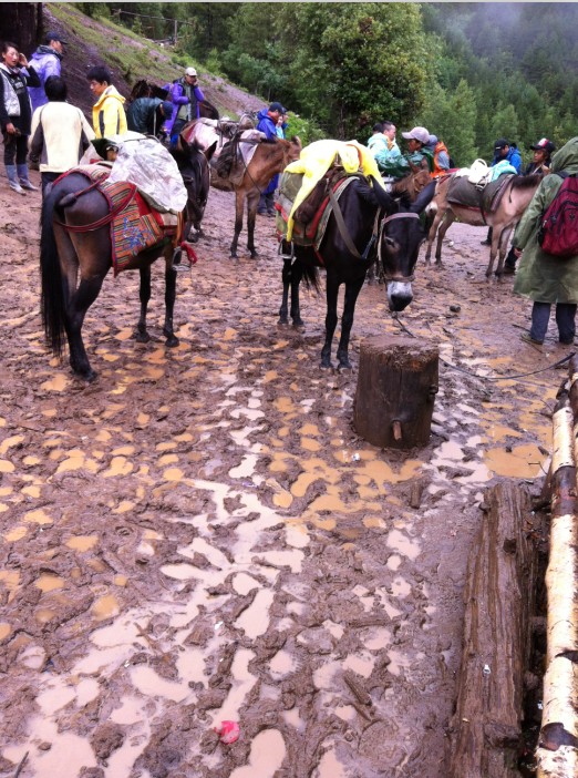 从飞来寺驱车到西当村,大约两小时,一路碎石烂路颠簸,一边是悬崖乱石,一边是汹涌的金少江水,一路不断的上山下山,海拔忽高忽低,时有出现恶心的症状,两小时的车程,似乎要丢了半条命了。到达西当村,一下车,又变成一大活人了。进雨崩那天下雨,18公里的山路异常的难行,一路泥土沼泽及骡子大便,娇生惯养的富二代蛋蛋及王兄,没到达西当村之前就要领队松吉先联系好马队,他俩自信自己体力不足,徒步不了进雨崩,坚决要骑马。九个队友之中,包括自己,在刚一轮高反反应后,再加一夜没眠,都很累的,大家商量好后,共有九队友骑马,其余的队友徒步进,真心的敬服~~~