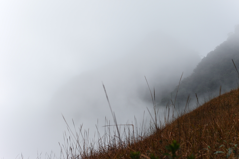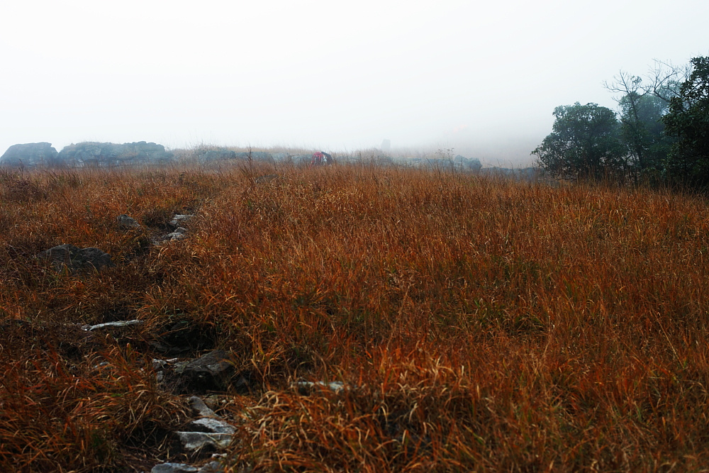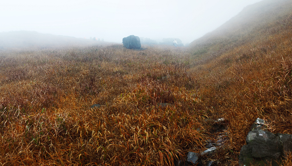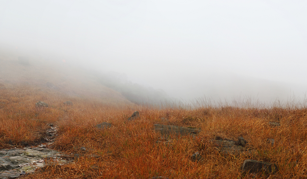 23日晚罗坑镇宵夜后走一小时机耕路到上斜村一空房30人混宿,次日7:45时出发至水渠乱石坡口集结。稍作休整,经近2小时上坡至垭口,简单补充食物后登上伤心大草坡。草坡较去年12月份的金黄稍逊色,但沿途雨雾天气却增添了一分悲凉和苍桑!过望营顶、小树林后,沿着低山坡行进片刻,约14:30时抵达一低洼地----去年12月月全食晚零下6度的露营地。浓雾夹着小雨和狂风一直笼罩着营地,上顶无望了。15时摆炉开伙,享用自带的梅菜猪肉和同伴的鱼干,分享了FB分子的焖鹅肉、卤水猪肉、凉伴木耳和青瓜等美食,17时晚餐结束,早早入帐,帐外不时传来西文、湾仔、浪儿、浮云和罗靓等人畅饮高飞、大哚狗肉的热闹声!