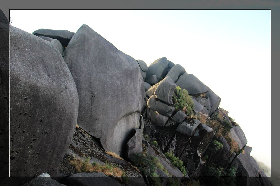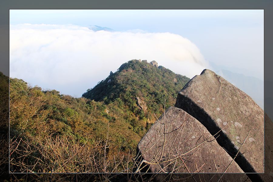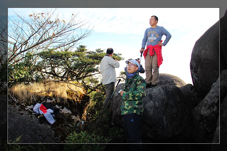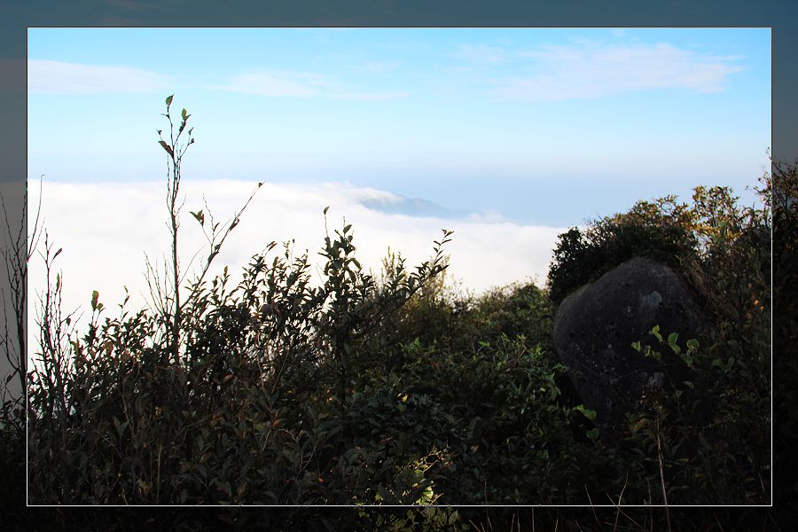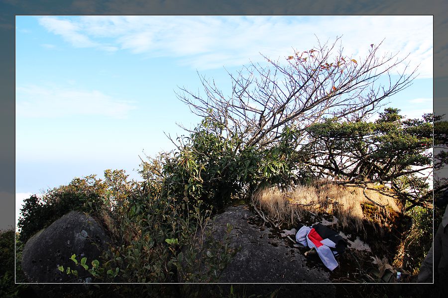 看完日出就登顶,但最后的一百米真是要命的难以攀爬,必须四肢发达,头脑清晰,难度几乎比得上穿窿山了。多艰难的攀登到了顶上都是值得的,四周此处最高,蓝天白云,群山在云海中若隐若现,清风吹拂,忘却万般烦恼。话虽如此,当看到躺睡在山巅的浪儿同学,多少还是有点咬牙切齿。