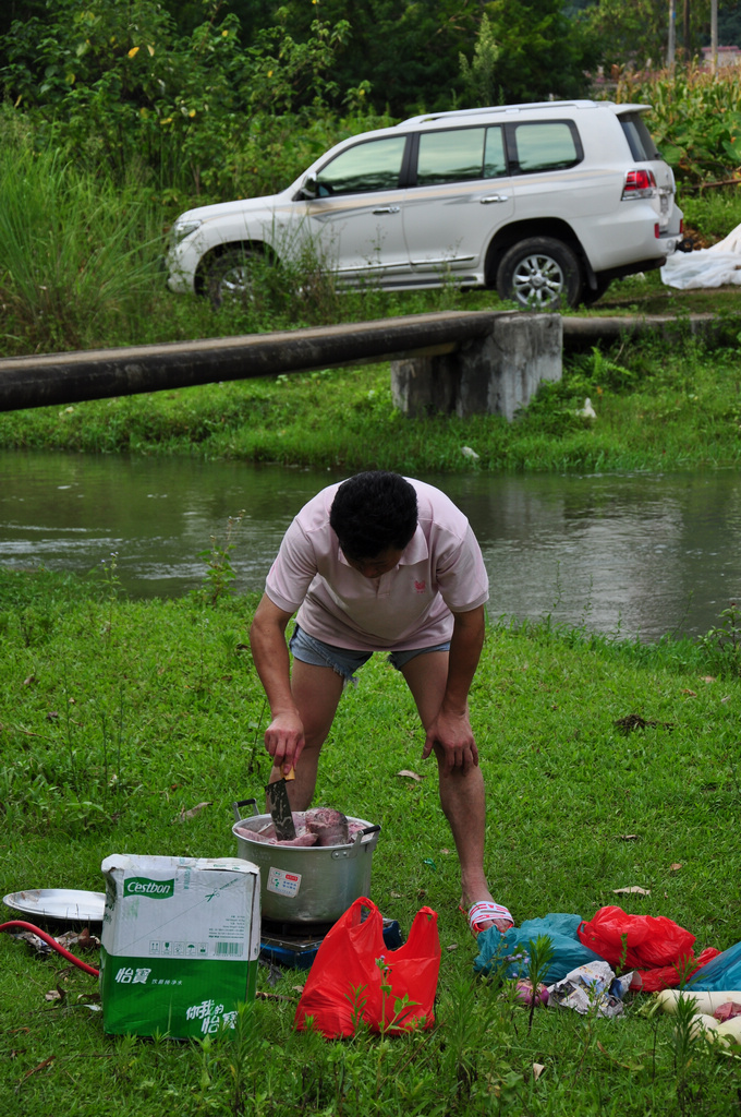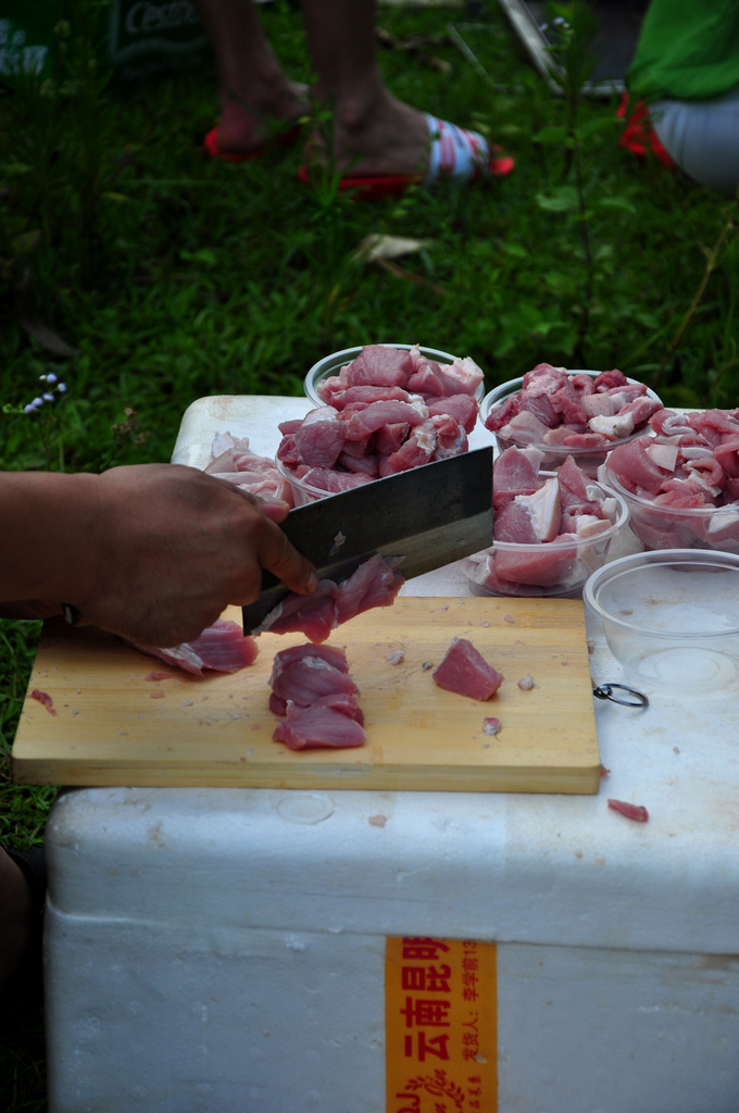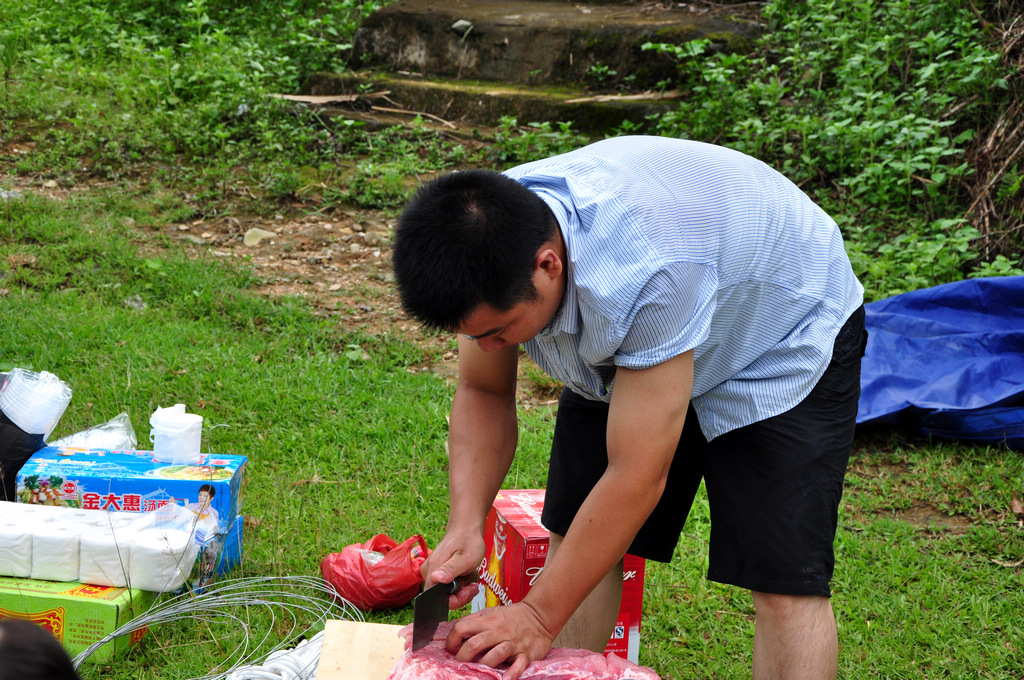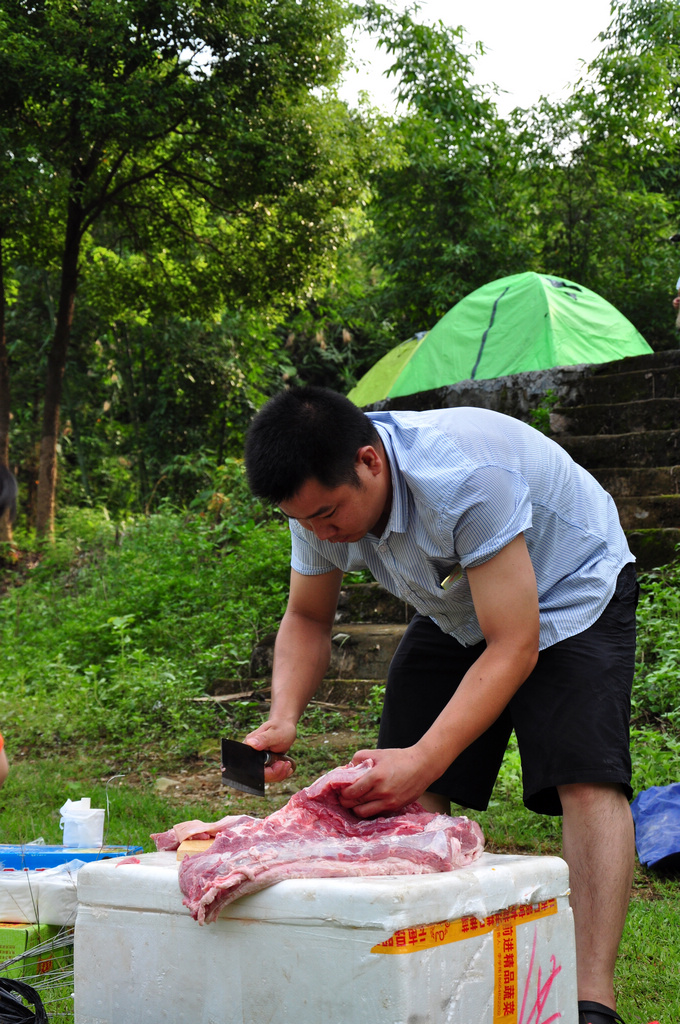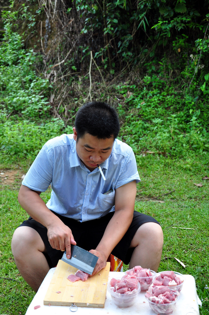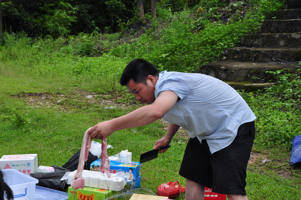这大叔切起猪肉有模有样