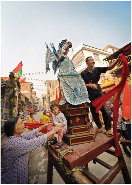 “大神”由人戴具扮演,穿龙袍坐龙椅头顶神伞,由八个汉子抬着。前边有戴着青面獠牙面具的“判官”和“行者”开路。其后是香案、锦架、龙狮、八音、十样锦锣鼓和小童扮的故事人物——许仙和白素贞、杨宗保和穆桂英等。