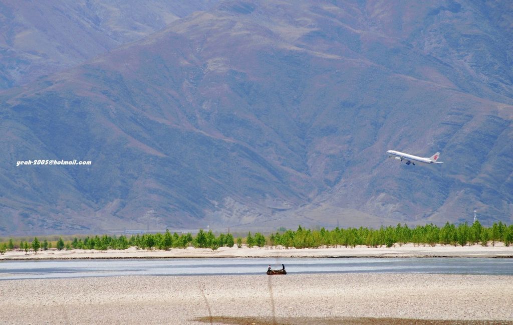 贡嘎机场起飞的飞机跃过雅鲁藏布江。