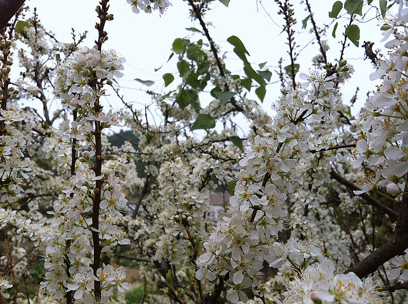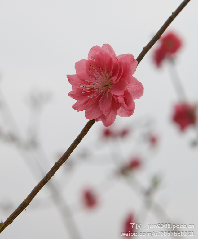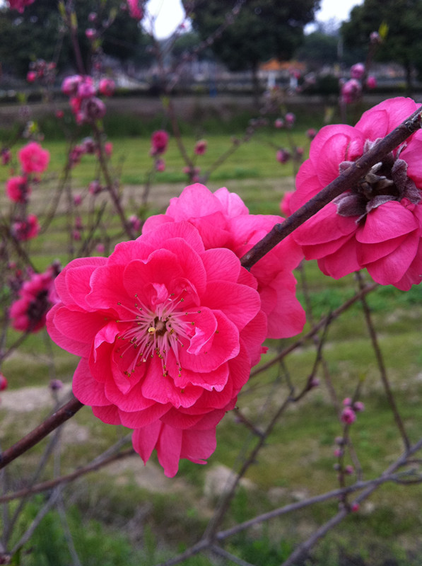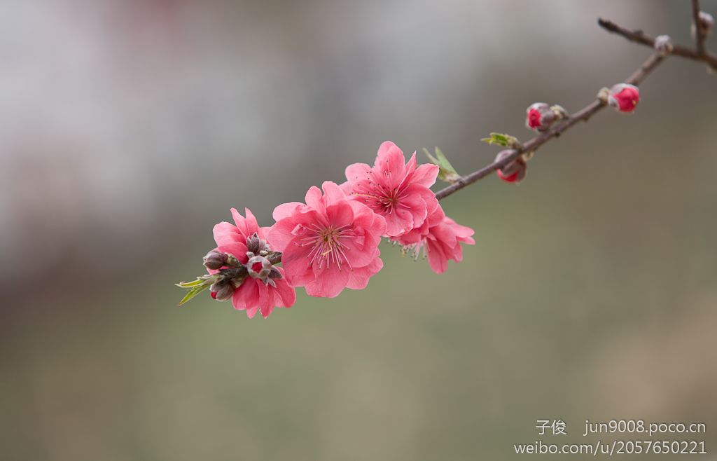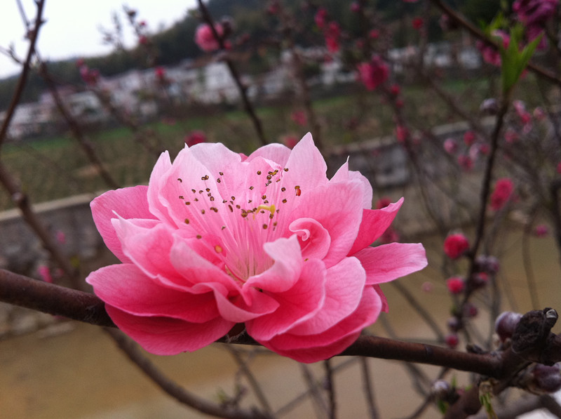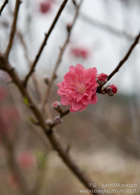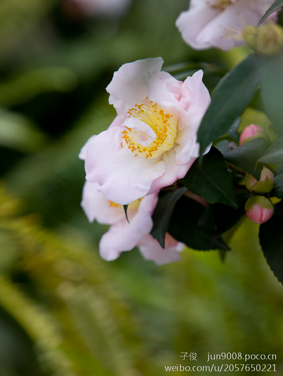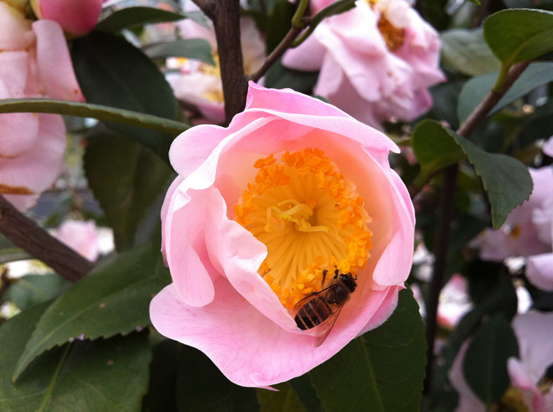 茶花香浓蜂依恋,桃花可爱深浅红。