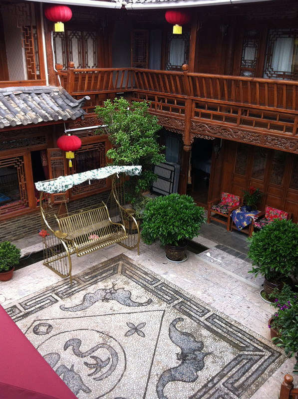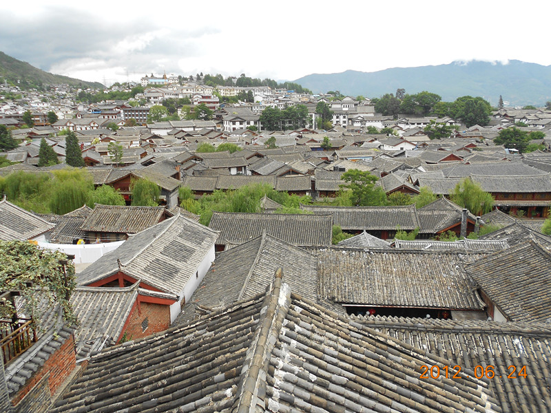 突然手机响了,是信息和电话,远在南京的氏无名和东莞的同学,TA们看新闻得知云南地震了,问候我还好否?刹时心暖暖的,远在他方,还有人牵挂问候,是件好幸福的事。丽江离地震的地方还挺远的,没受什么影响。上QQ时,在泡Q群时,清远的群友们纷纷的问好,特感动。接下来的行程会很艰辛,听刚从雨崩回来的驴友们说,那里连续下雨,路很烂,行程要比天气晴时艰辛很多了,路上烂泥路有积水的地方还有蚂蟥出现,叫我们要慎行。。其实我也有纠结过是否要改变行程的,后来想想,既然都决定了,就风雨无阻的前进吧,越是难走的路,就会有越多的美景在,要不,怎么会有成千上万的疯子们去追随梅里雪山一睹她容颜呢。突然,不想再逛丽江大街小巷的商店了,想上高处看看丽江是什么样子的,免费登上一间客栈的天台俯瞰丽江古城屋顶上的一片瓦海,看不到熙熙攘攘商店人潮,这会终于感受到了丽江的纯朴与宁静,这才是一个发呆的好地方。