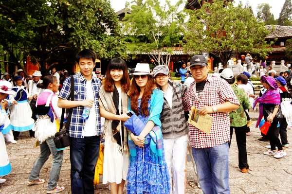 欢乐的时间过得总是感觉特别的快的,午餐时间到了,这天的午餐很特别,王兄的朋友“纳西人家“的苏老板请我们上他家的客栈吃午餐,他过来四方街接我们时,王兄叫他帮我们拍张合照。拍照时,蛋蛋是很专业的背夫,我的包包,婷婷的相机包他全包了。在后来,我的包包就一直都是蛋蛋给背了,原来当女生挺好的。