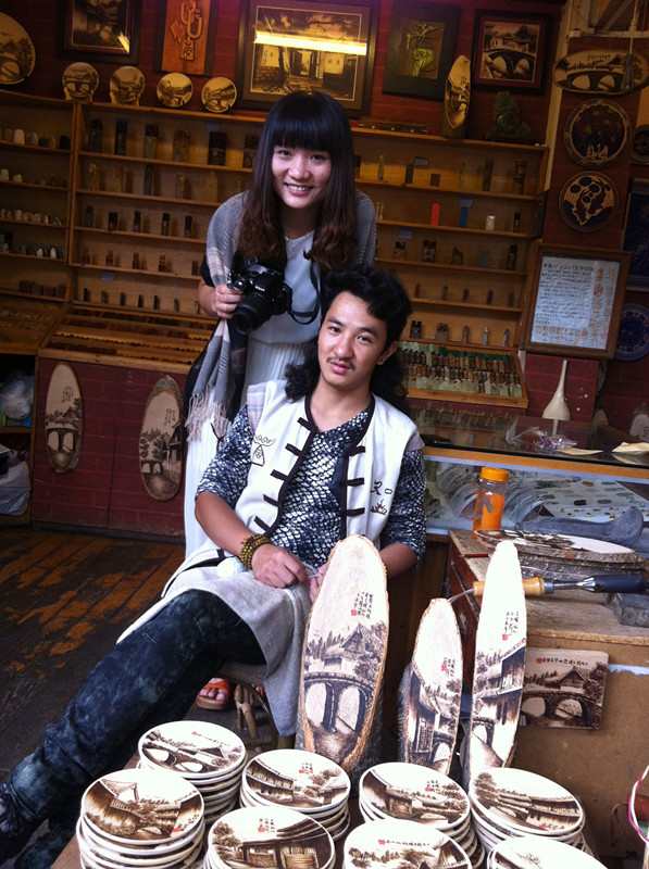 都说男人陪女人逛街是件很累的事,特别是看女人们爱臭美时更累,王兄在一旁默默无语,蛋蛋在傻笑无语,善解人意的我们叫他们先回客栈休息,我们四女的继续逛逛购物。他俩回去后,我们女队友们的艳遇率会更高的,有木有呢?这话刚一说完,在路过一木艺店,宝贝突然兴奋的说:“这店的帅哥好帅啊,要不进去看看吧“ 店里那帅哥正在很认真的雕刻着木艺品,见我们进来以后,他停下了手上的活,朝我们微微一笑,话不多,果然很帅,搭讪的潜力突然暴发出来了,帅哥被我俩逗得有点不好意思了,脸还泛起了晕红,只顾着搭讪帅哥,和婷婷小燕子她们都走散了,我们得赶紧找她俩去才是了,走的的时候,还不忘要和帅哥合拍一张照片,还管帅哥要了联系的方式呢。