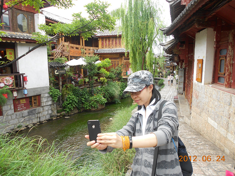 稍晚,白衣天使宝贝从成都姗姗来迟,接见她后,宝贝不顾舟车劳顿,跟上了我们一起逛街购物了,俗话说:三个女人一台戏,现在四个女的在一起,那是何等的戏,好吧,我来说说吧,四个女的在一起,除了爱自拍、拍照、拍照还是拍照,大致就是这些了,王兄和蛋蛋俩男的,只有看戏的份上了。在四方街旁边一处小桥流水的地方,我当起了色影师,负责尽情的给她们拍照。可是很不幸的,我给她们拍照时的我的各种囧照也被别人拍下了。