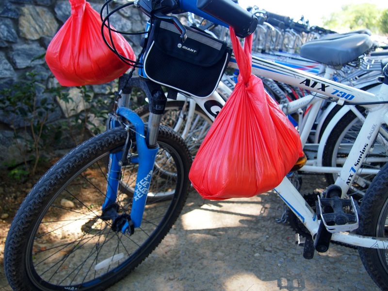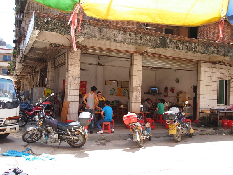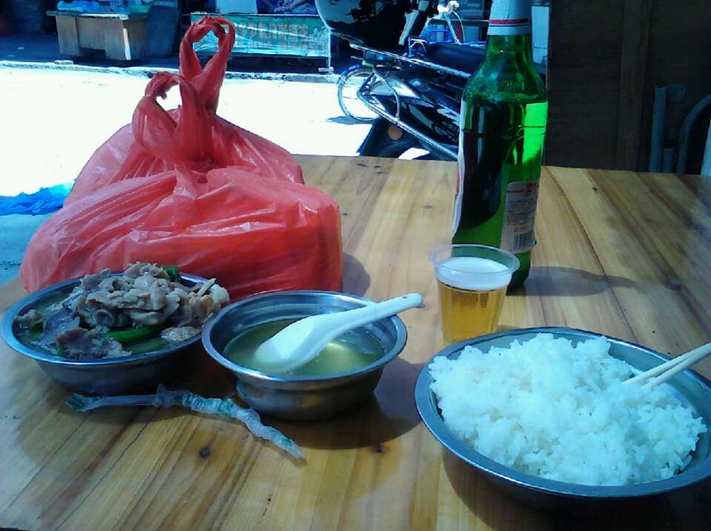 我买了两大包共7斤的豆腐。。。因为怕压坏,不敢放背包,就挂在车头,所以就不想到处找吃的了,刚还市场旁边就有个小饭店