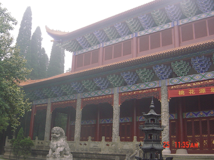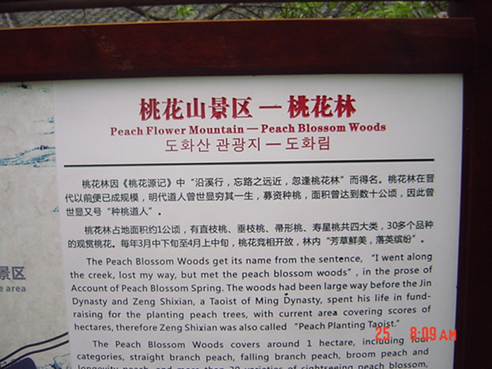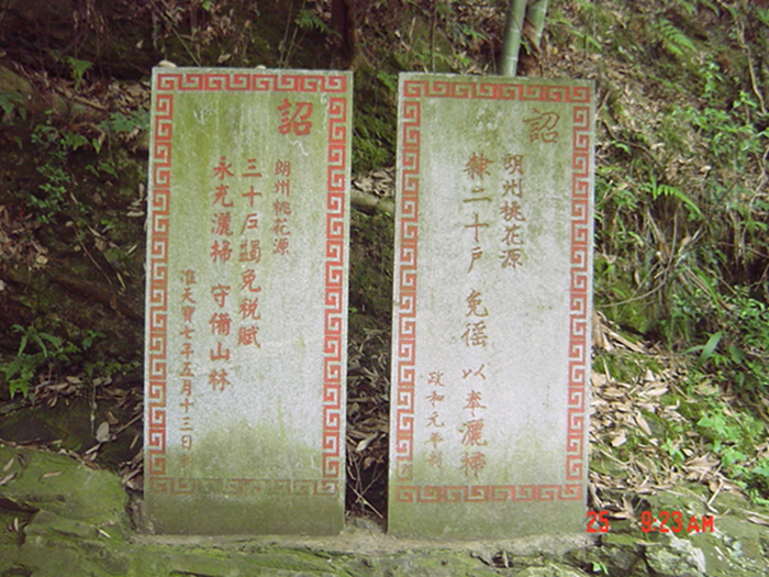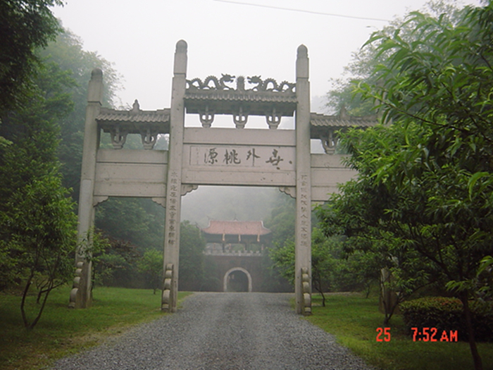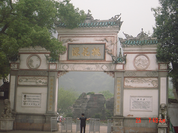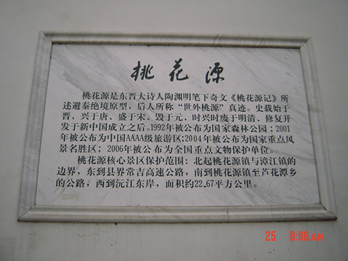 东晋太元年间,武陵郡有个人,以打鱼为生。有一天,他沿着溪水划船,忘记了路的远近。忽然遇到一片桃花林,紧靠着两岸生长有几百步。其中没有其他树,花草鲜嫩美丽,落花纷纷。渔人感到很惊奇。继续往前走,想走到林子的尽头。 林子的尽头是溪流的源头,于是出现了一座小山,山上有一个小洞口,隐隐约约好像有点亮。渔人于是离开船,从洞口进去。起初很狭窄,仅容一个人通过。又走了几十步,突然变得开阔明亮。这里土地平坦宽阔,房屋整整齐齐,有肥沃的田地,美丽的池塘和桑树竹子之类。田间小路交错相通,鸡鸣狗叫之声可以互相听到。在那里人们来来往往耕种劳作,男女的穿着打扮,完全都像桃花源外的世人,老人和小孩,都安闲快乐。 桃花源里的人见到渔人,大吃一惊,问渔人从哪里来。渔人详细地回答了他的问题,有人便邀请渔人到自己家里去,摆酒杀鸡做饭来款待他。村中的人听说有这样一个人,都来打听消息。他们自己说他们的祖先为了躲避秦时的战乱,带领着自己的妻子儿女及乡邻们来到这与世隔绝的地方,不再出去了,于是就与外面的人断绝了来往。 桃花源里的人问现在是什么朝代,竟然不知道有汉朝,更不必说魏朝和晋朝了。渔人把自己听到的事一一详细地告诉了他们,村中的人都感叹惋惜。其余的人又各自把渔人请到自己的家中,都拿出酒食来款待他。渔人逗留了几天以后,告辞离开了。这里的人对渔人说:“这里的情况不值得对外边的人说啊!” 渔人离开桃花源以后,找到了他的船,顺着从前的路回去,处处都做了标记。到了郡城,拜见了太守,说了自己的这番经历。太守立即派人跟随他前往,寻找以前做的标记,竟然迷了路,再也找不到通往桃花源的路了。 南阳人刘子骥,是志向高洁的隐士,听说了这件事,高兴地计划前往。没有实现,不久就病死了。此后就再也没有人访求桃花源了。