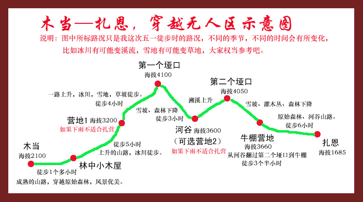此路段提示: 尽量在天黑前走完,赶早上路。夜间温度很低,做好防寒准备 。