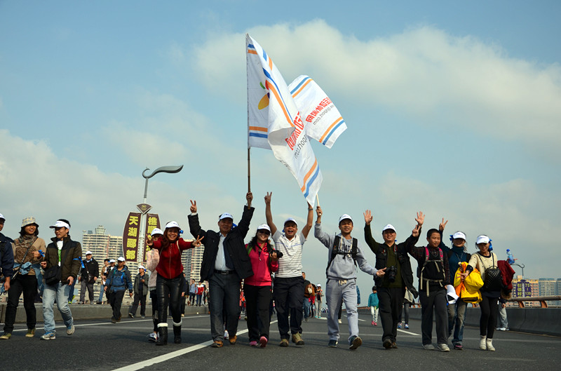 一群充满阳光的休闲网驴友们在阳光的照耀下,拉着大旗在千人队伍里好拉风:victory: