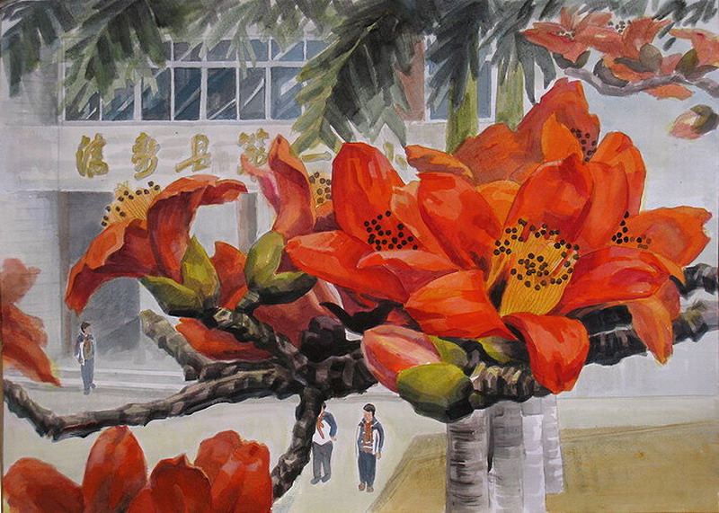 树下的一个人为什么少半边头,意境是什么。是不是在红棉重压下的小孩