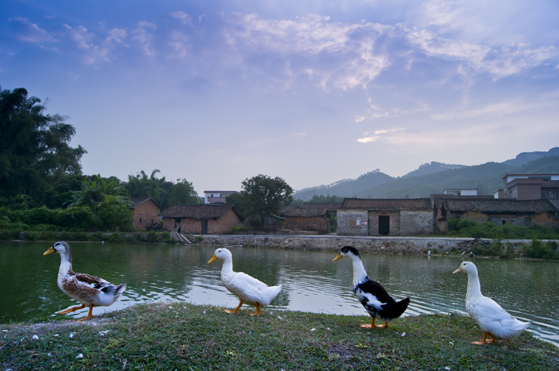 村前的景象。有趣的四只鸭,呵,喜欢这场景,下车拍了下来。
