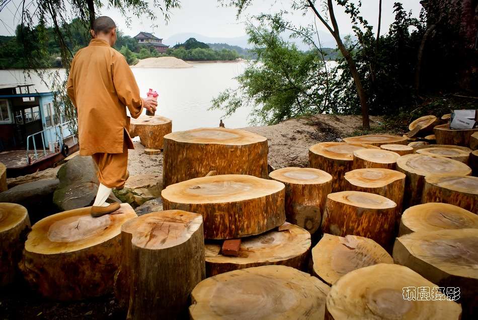 2012年4月26日,黎溪丰盛古寺,过渡时见到许多很大的木桩,几个和尚在搬这些木头。