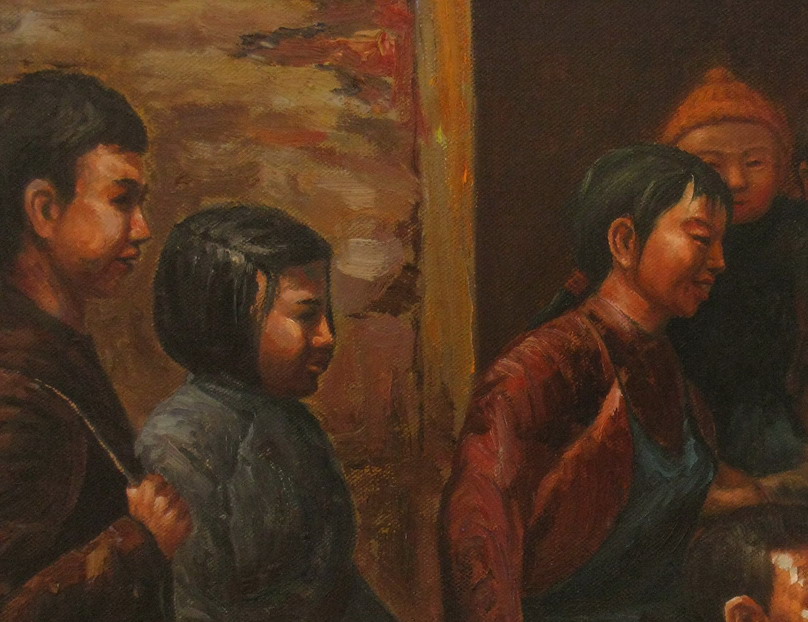 创作时,邓志文和叶秀银分工明确,丈夫主要画人物,妻子则主攻风景。完成一幅作品所需的时间视难易程度而定,既有不到一小时就能成就一幅抽象画的畅快,也有花上三个月雕琢一幅人物画的精心。而说起他们最爱的作品,要数《晨》,它描绘的是英德市英西名景—“小布达拉宫”,那古老别具一格的设计建筑,还有那远去的传说,深深吸引着两人。叶秀银回忆,当时去写生刚好是日出的一刻,朝阳照散了晨雾,阳光从树缝里照进建筑群,清新美丽极了,他们的创作热情油然而生,于是很快在晨光中完成了水彩写生,回家第一时间就开始了油画创作,妻子画树画房子,丈夫画人物车辆,用了一个星期完成了这幅作品。叶秀银早在学生时代就被油画深深吸引,她总是赞叹“油画色彩绚丽厚重,那些世界名画都太美了”。邓志文呢?在秀银看来,他对油画的喜爱程度不如自己,但学得更好。“我爱好广泛,却没一门学得很精,是周身刀没把利的那种人!”叶秀银笑着说。这对草根画家夫妻,对家乡和艺术深深的眷恋,感染着身边的每一个朋友。