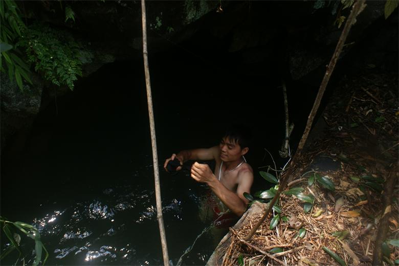 分为上潭-虎穴和下潭-龙潭,虎穴用绳索便可传递物资而过,龙潭则需高危攀石而下,三人游泳合力穿递背包而过。上潭需有人先爬下去,可以攀壁而过,可以溯潭而下,有一平躺的大石十分湿滑,不可以由此而过,十分危险。虎穴过后又逢龙潭,由虎穴下龙潭岸时,也需先有人下去,上面做保护,下去后先把物资包包传下去安置,然后下面做接应而下,此处较为危险需谨慎小心。龙潭经多次攀壁传包摸索,认为最便捷及省力的办法就是几人分别游水于潭中,靠左岸岩壁一一传递而过,稍有不慎则包入潭中(下图有图示传物点)。(当然如果有带全放水袋,则可以直接游过)此潭长二三十米,宽约八米,水深三四米。
